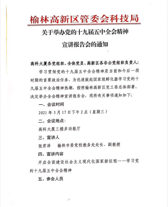 2020年10月26日至29日,中國共產(chǎn)黨第十九屆中央委員會(huì)第五次全體會(huì)議在北京召開。這次全會(huì)是在全面建成小康社會(huì)勝利在望、全面建設(shè)社會(huì)主義現(xiàn)代化國家新征程即將開啟的重要?dú)v史時(shí)刻召開的一次十分重要的會(huì)議。因此,榆林高新區(qū)黨工委總體部署,決定舉辦全會(huì)精神宣講報(bào)告會(huì)議,將全面深入學(xué)習(xí)黨的十九屆五中全會(huì)精神作為最重要的政治任務(wù)抓牢抓實(shí)。