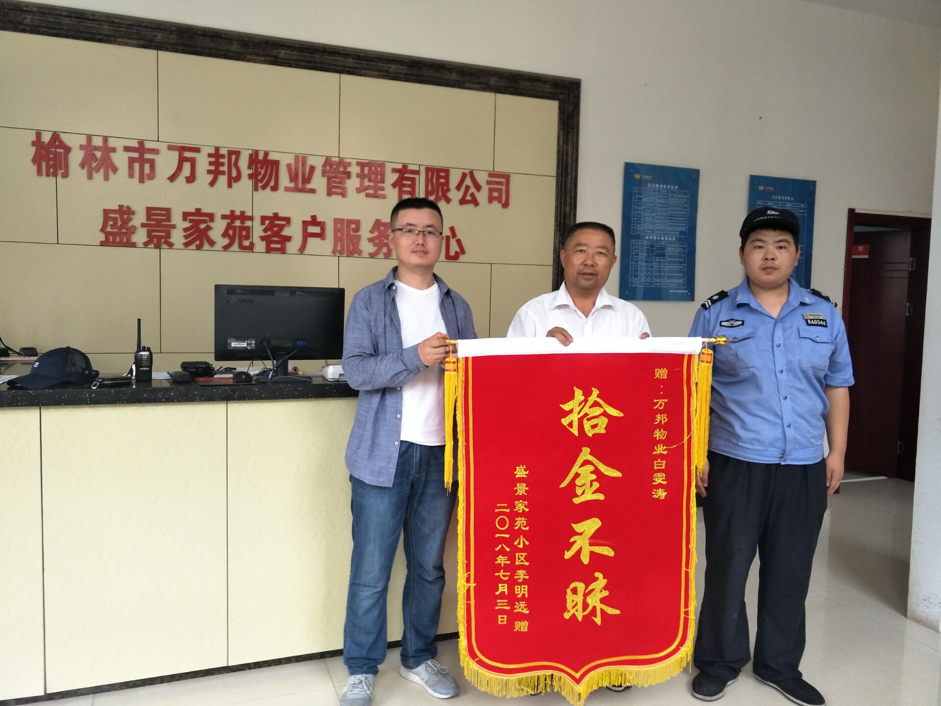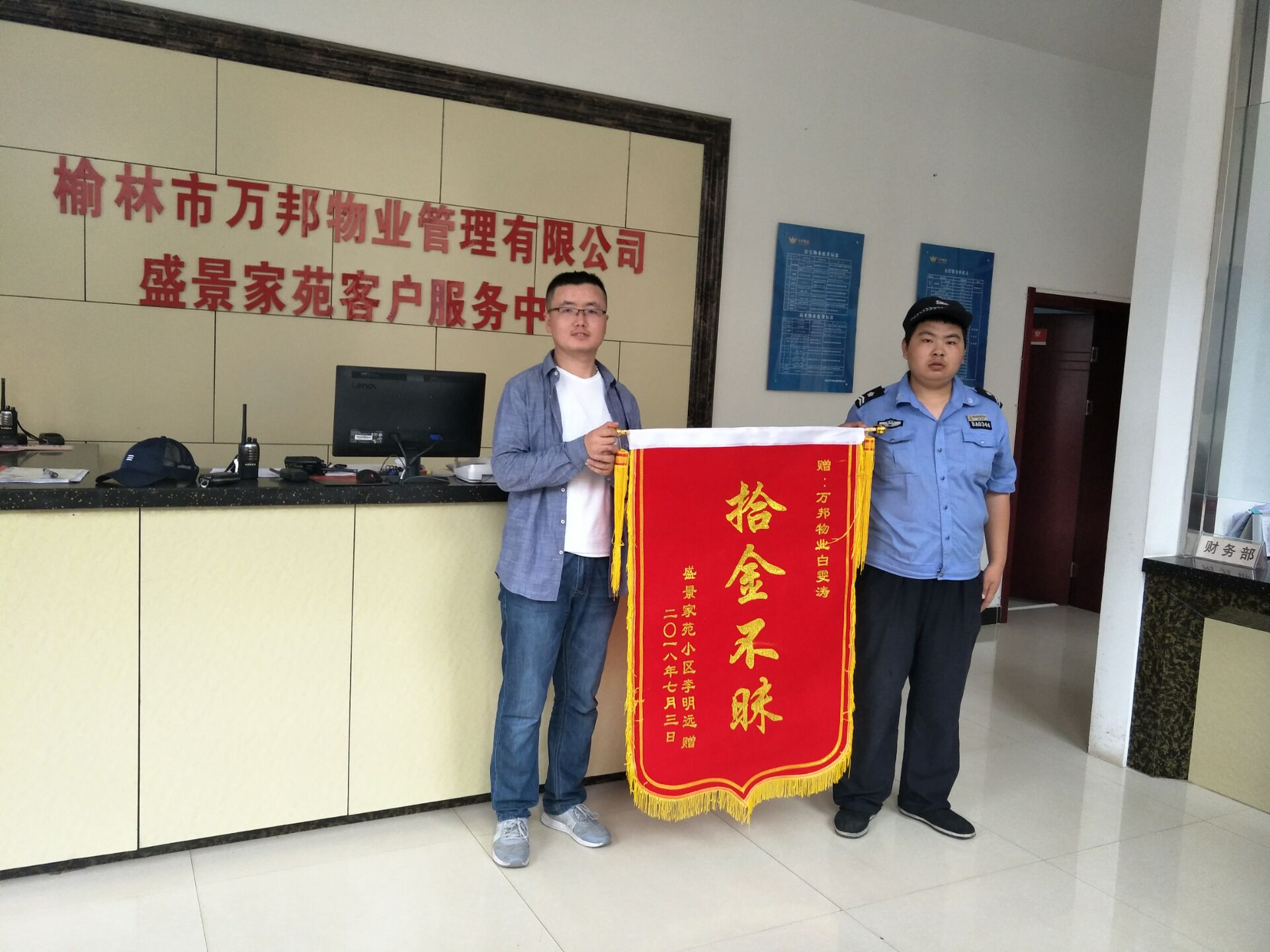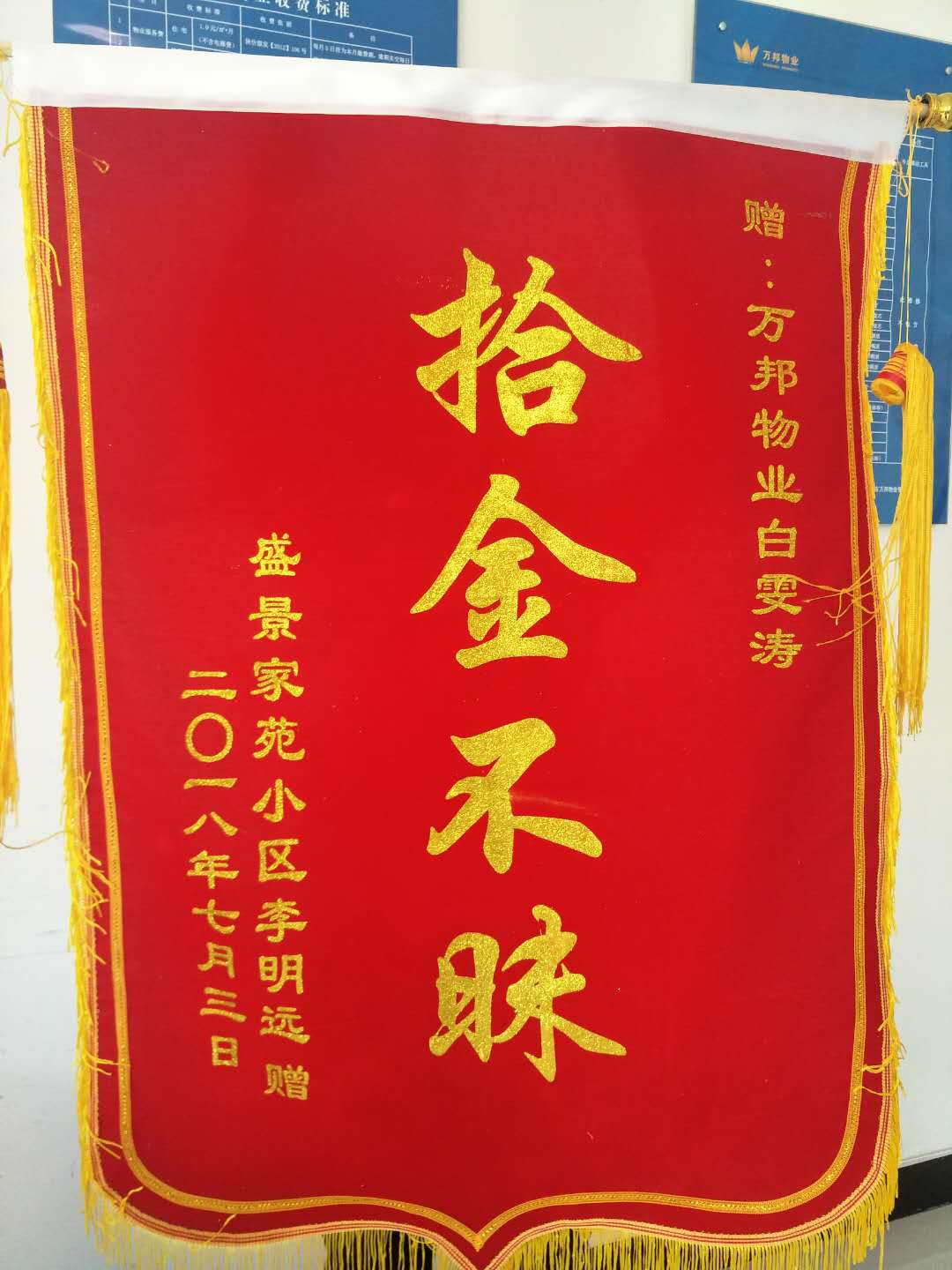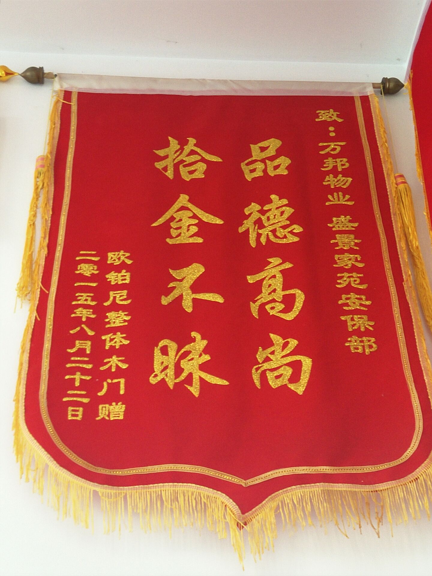 同時我安保人員多次拾撿到業(yè)主和客戶貴重財(cái)物,并在第一時間將遺失財(cái)物歸還,多次獲“品德高尚   拾金不昧”、“助人為樂,精神高尚,安全職守,盡職盡責(zé)”、“情系業(yè)主   服務(wù)熱情”等錦旗;