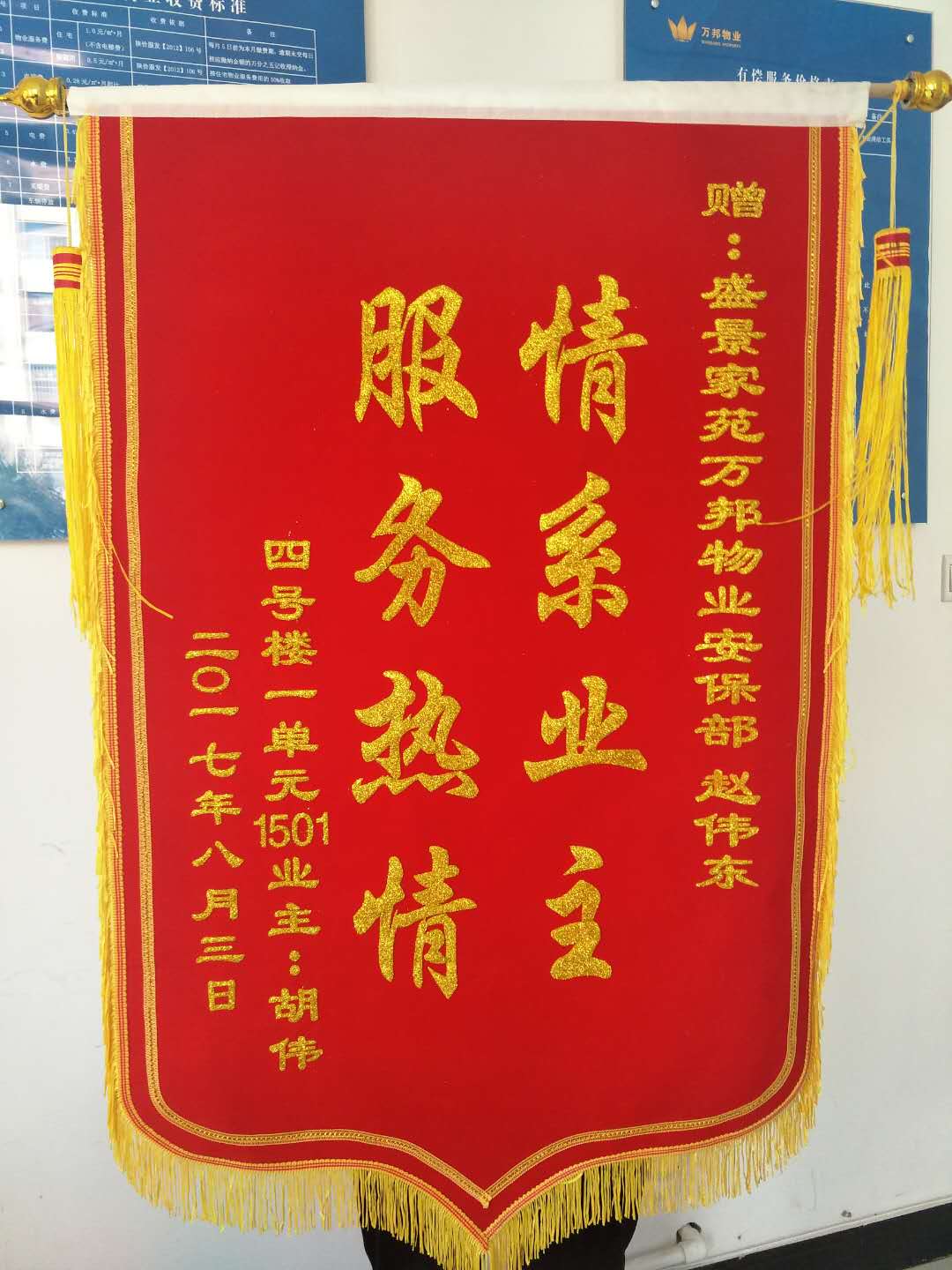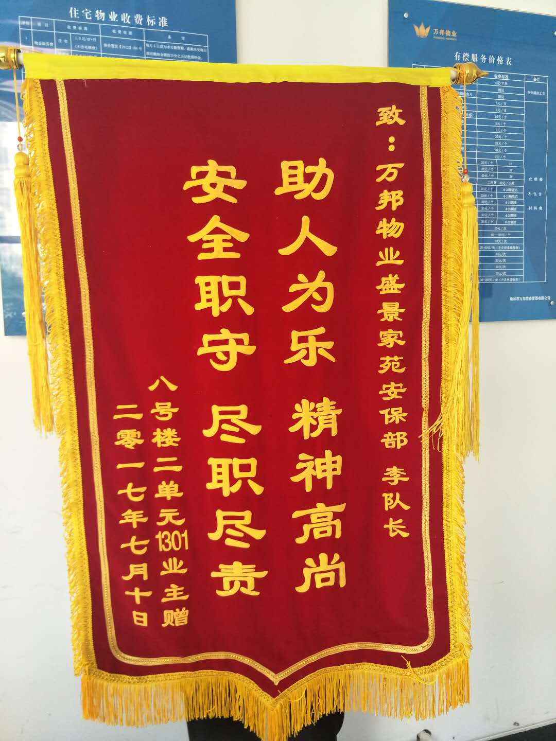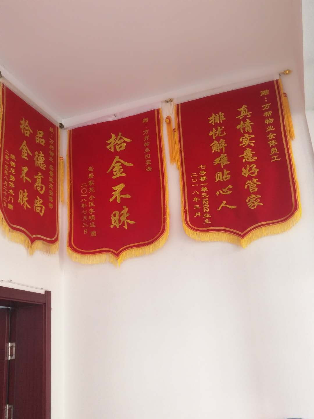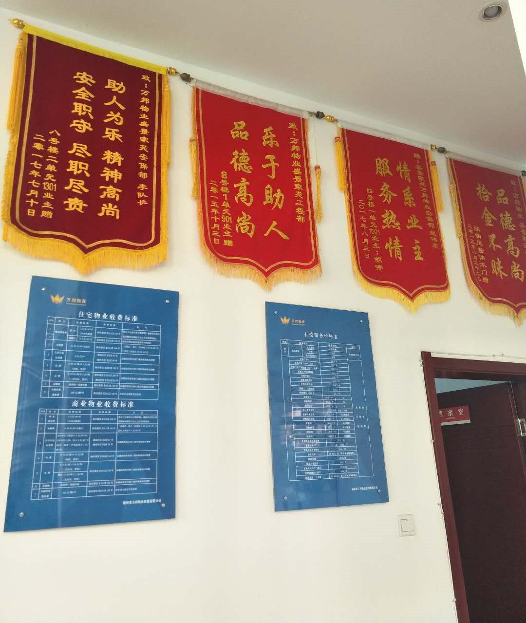 近年我們的榮譽(yù)墻逐漸被錦旗覆蓋!也讓全體工作人員感到了自己身上的那份責(zé)任,更加激發(fā)了大家的工作熱情。今后我們將做好“真情實(shí)意好管家,排憂解難貼心人”為業(yè)主提供更好的服務(wù)。