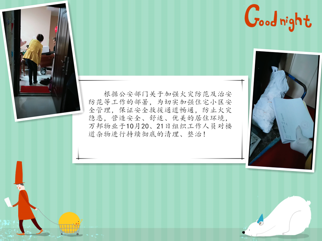 根據(jù)公安部門關(guān)于加強火災(zāi)防范及治安防范等工作的部署,為給業(yè)主創(chuàng)造一個優(yōu)美、舒適、安全的居住環(huán)境。我物業(yè)公司一直堅持不懈的做著此工作,本月針對長期占用公共區(qū)域堆放雜物的業(yè)戶進行統(tǒng)一上門清理,并向業(yè)主傳達相關(guān)消防法律知識。