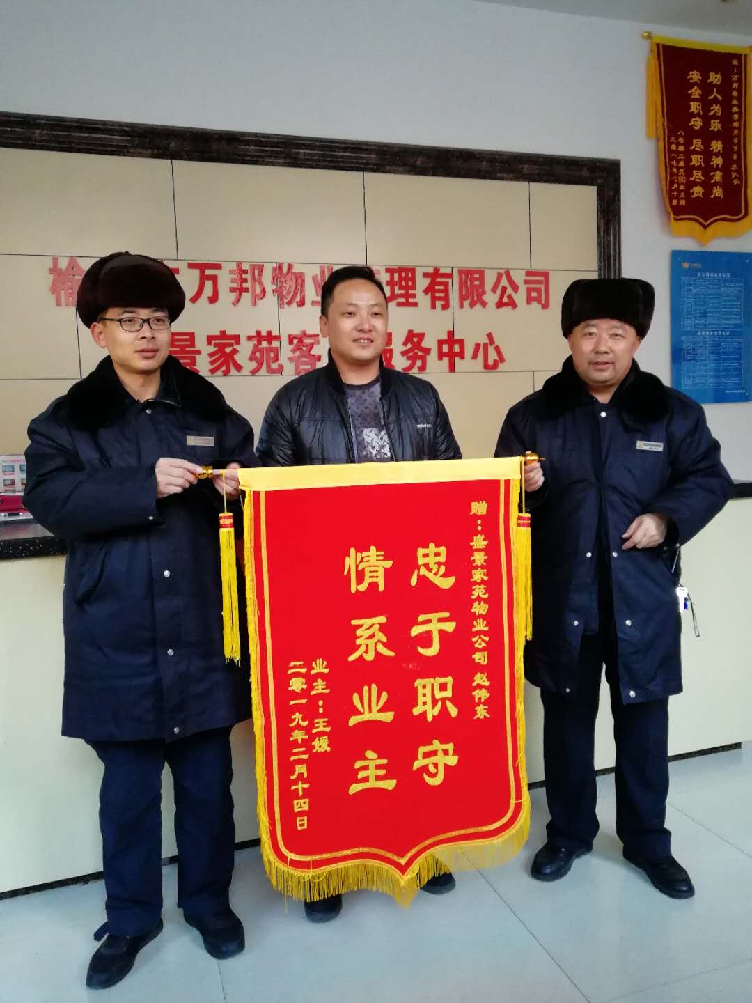 這一舉動感動了業(yè)主,今日業(yè)主親自將錦旗授予我們,大大鼓舞了我們員工的工作熱情。我們必將竭盡全力做好物業(yè)公司的各項工作,情系業(yè)主,服務業(yè)主。