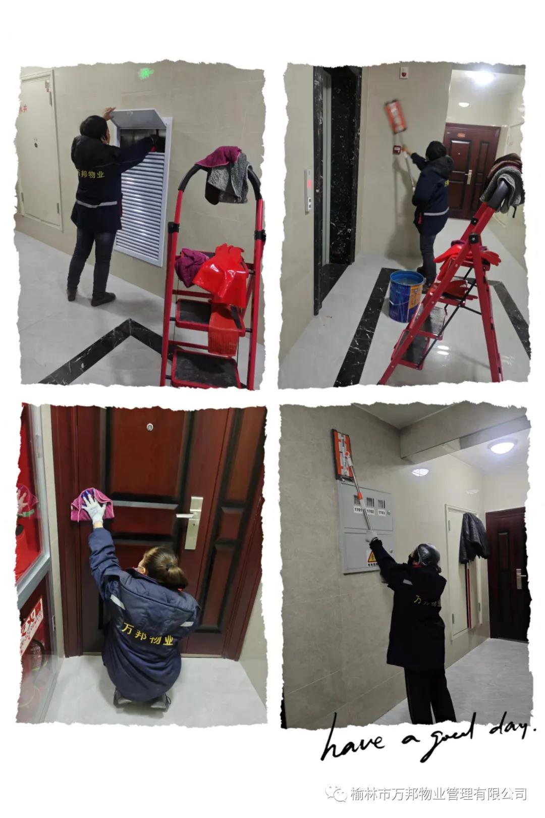 環(huán)境部工作人員使用專業(yè)的設備和清潔劑,對墻面、地面、及玻璃上的污漬及裝修殘留垃圾進行清理,各項工作井然有序的進行著!她們精心檫拭著每一個環(huán)節(jié),力求為業(yè)主營造出無污漬、光亮潔凈的居住環(huán)境!
