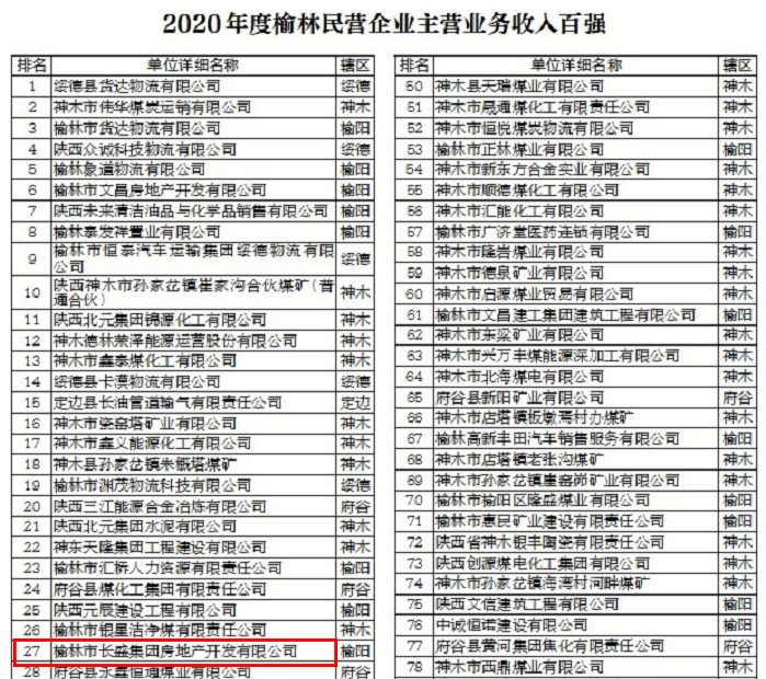 喜報(bào)|長盛地產(chǎn)、成建路橋榮登“榆林市2020年度‘五上’企業(yè)主營業(yè)務(wù)收入排行榜”