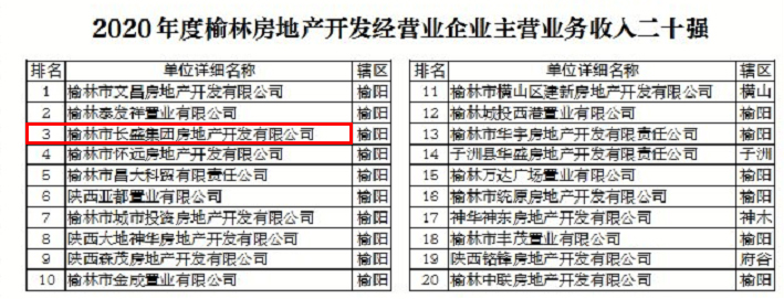 在公布的2020年度榆林房地產(chǎn)開發(fā)經(jīng)營業(yè)企業(yè)主營業(yè)務(wù)收入二十強(qiáng)名單中,榆林市長盛集團(tuán)房地產(chǎn)開發(fā)有限公司排第3名。