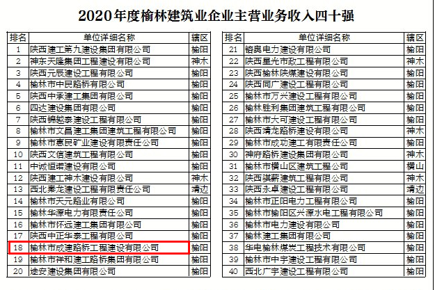 在公布的2020年度榆林建筑業(yè)企業(yè)主營業(yè)務(wù)收入四十強(qiáng)名單中,榆林市成建路橋建設(shè)有限公司排第18名。